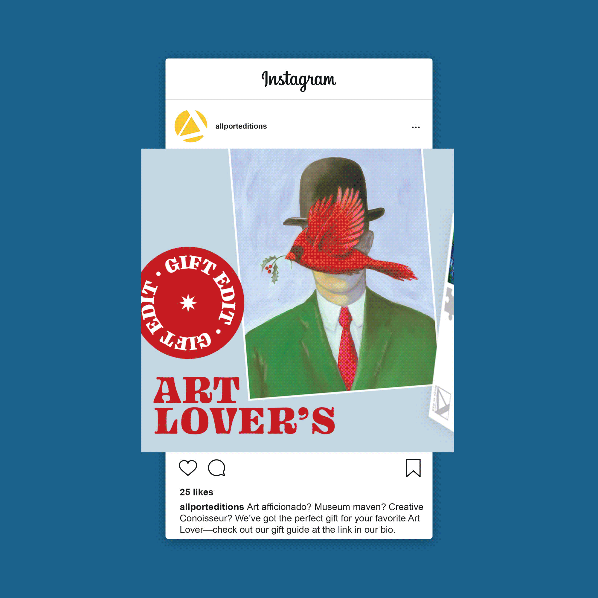 For the holiday 2022 social media campaign, I shot and edited product photography, sourced imagery for and compiled a series of gift guides for posts and stories, designed postcards for our annual sales and adapted the designs for social media use, and created a series of animated reels based on our cards using After Effects.