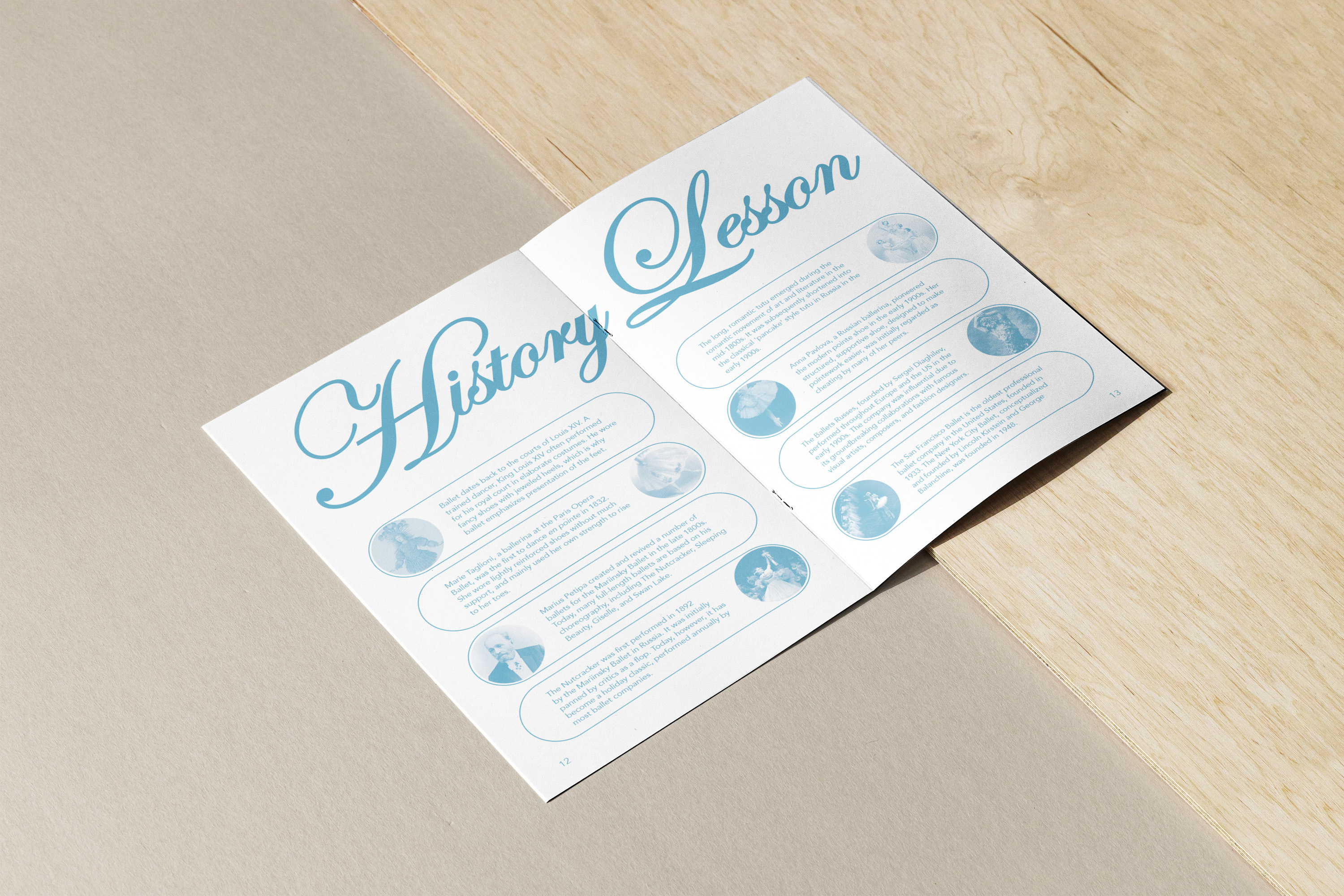 I chose a single-color palette to help the zine feel even more elegant. The blue shade I selected is inspired by my favorite ballet, George Balanchine’s Serenade, an abstract ballet featuring monochromatic blue costumes with flowing, romantic skirts. A full spread photograph of the ballet is featured on the page 18-19 spread.